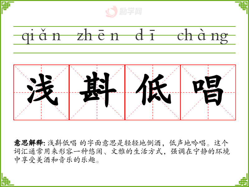 浅斟低唱 的字面意思是轻轻地倒酒,低声地吟唱。这个词汇通常用来形容一种悠闲、文雅的生活方式,强调在宁静的环境中享受美酒和音乐的乐趣。
