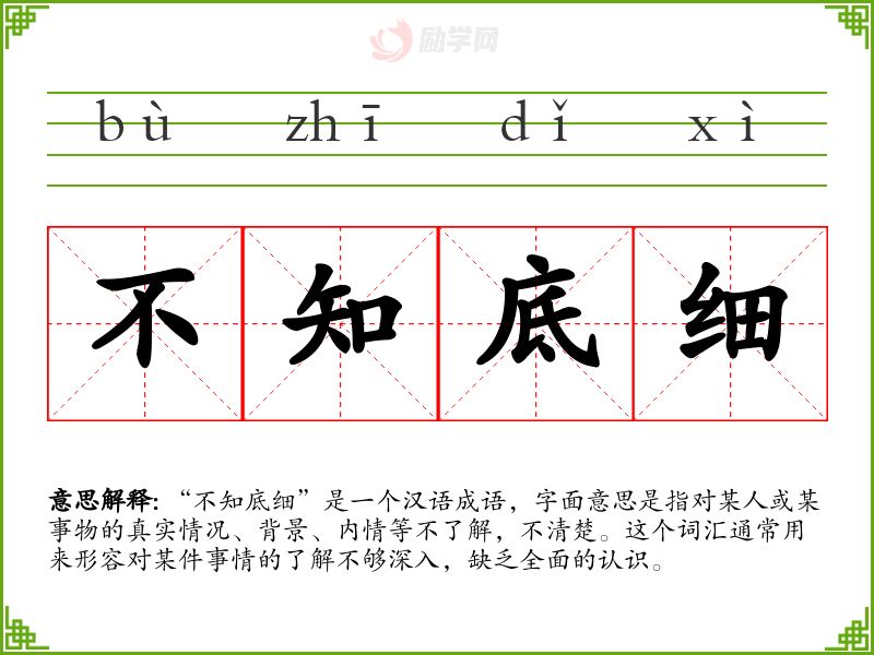 “不知底细”是一个汉语成语,字面意思是指对某人或某事物的真实情况、背景、内情等不了解,不清楚。这个词汇通常用来形容对某件事情的了解不够深入,缺乏全面的认识。