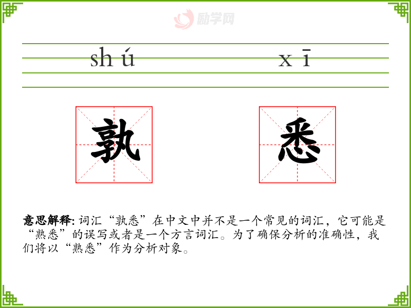 词汇“孰悉”在中文中并不是一个常见的词汇,它可能是“熟悉”的误写或者是一个方言词汇。为了确保分析的准确性,我们将以“熟悉”作为分析对象。