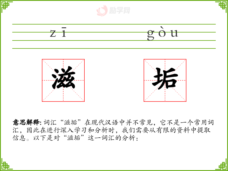 词汇“滋垢”在现代汉语中并不常见,它不是一个常用词汇,因此在进行深入学习和分析时,我们需要从有限的资料中提取信息。以下是对“滋垢”这一词汇的分析: