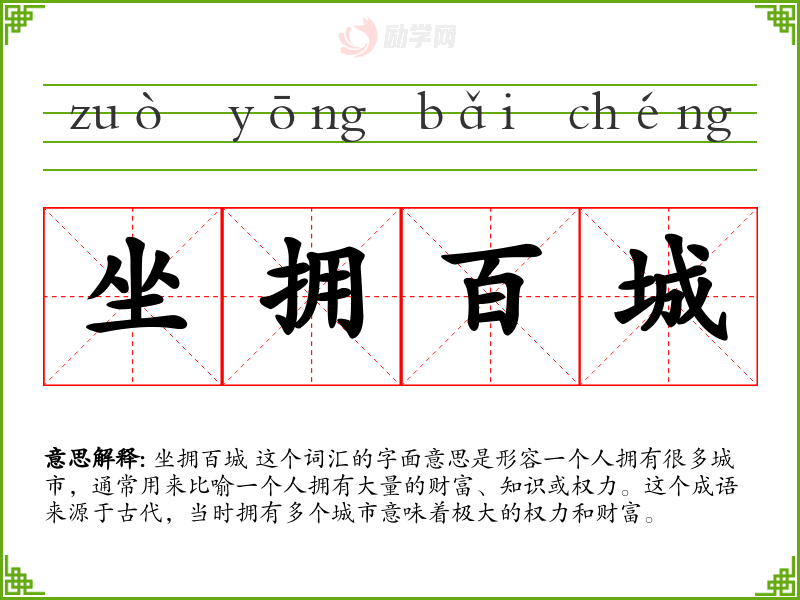 坐拥百城 这个词汇的字面意思是形容一个人拥有很多城市,通常用来比喻一个人拥有大量的财富、知识或权力。这个成语来源于古代,当时拥有多个城市意味着极大的权力和财富。