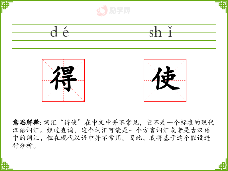 词汇“得使”在中文中并不常见,它不是一个标准的现代汉语词汇。经过查询,这个词汇可能是一个方言词汇或者是古汉语中的词汇,但在现代汉语中并不常用。因此,我将基于这个假设进行分析。