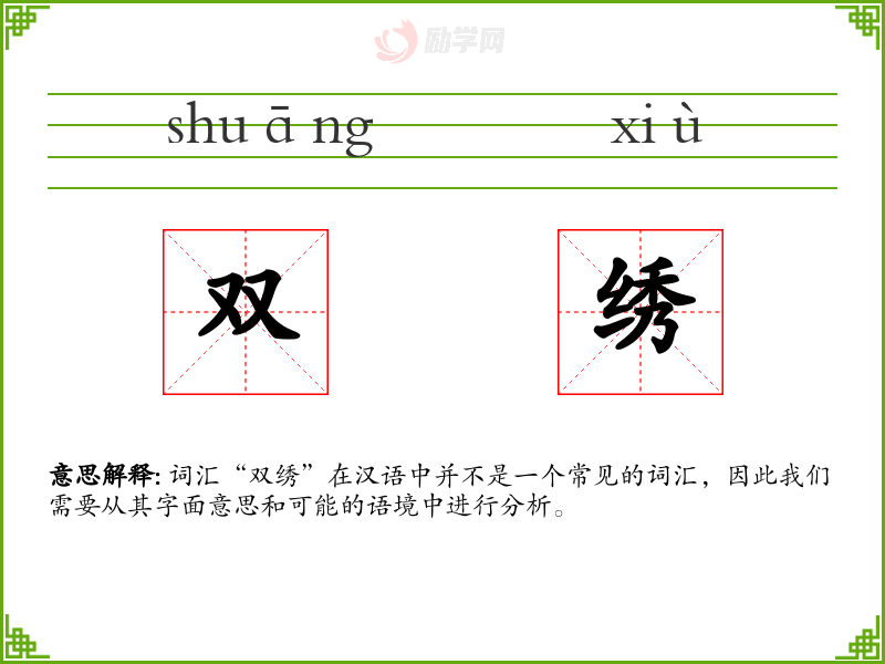 词汇“双绣”在汉语中并不是一个常见的词汇,因此我们需要从其字面意思和可能的语境中进行分析。