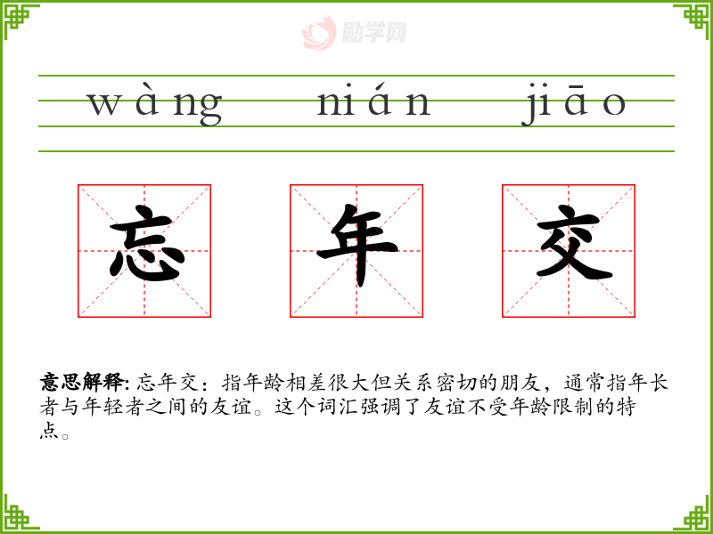 忘年交:指年龄相差很大但关系密切的朋友,通常指年**与年轻者之间的友谊。这个词汇强调了友谊不受年龄限制的特点。