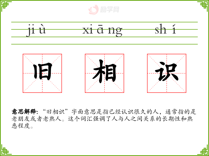 “旧相识”字面意思是指已经认识很久的人,通常指的是老朋友或者老熟人。这个词汇强调了人与人之间关系的长期性和熟悉程度。