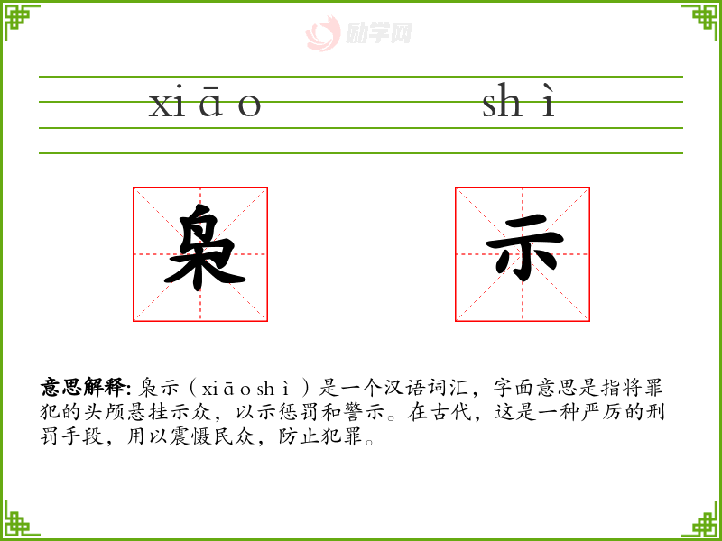 - 口语:在现代口语中,枭示一词较少直接使用,但可能会用“示众”、“公开处决”等词汇来表达类似的意思。