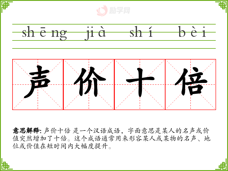 声价十倍 是一个汉语成语,字面意思是某人的名声或价值突然增加了十倍。这个成语通常用来形容某人或某物的名声、地位或价值在短时间内大幅度提升。