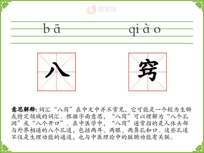 - 词源:“八”表示数量,“窍”指孔洞或开口。