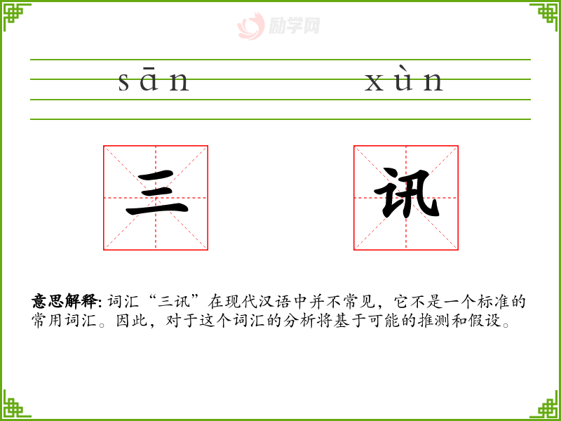 - 反义词:无(由于“三讯”不常见,反义词难以确定)