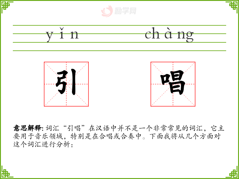 词汇“引唱”在汉语中并不是一个非常常见的词汇,它主要用于音乐领域,特别是在合唱或合奏中。下面我将从几个方面对这个词汇进行分析: