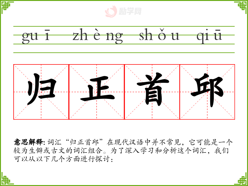 词汇“归正首邱”在现代汉语中并不常见,它可能是一个较为生僻或古文的词汇组合。为了深入学习和分析这个词汇,我们可以从以下几个方面进行探讨: