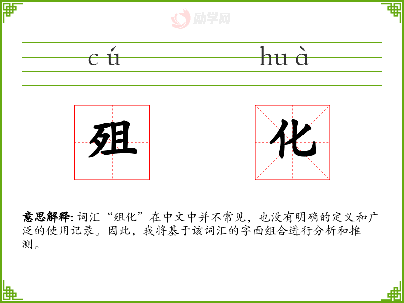 词汇“殂化”在中文中并不常见,也没有明确的定义和广泛的使用记录。因此,我将基于该词汇的字面组合进行分析和推测。