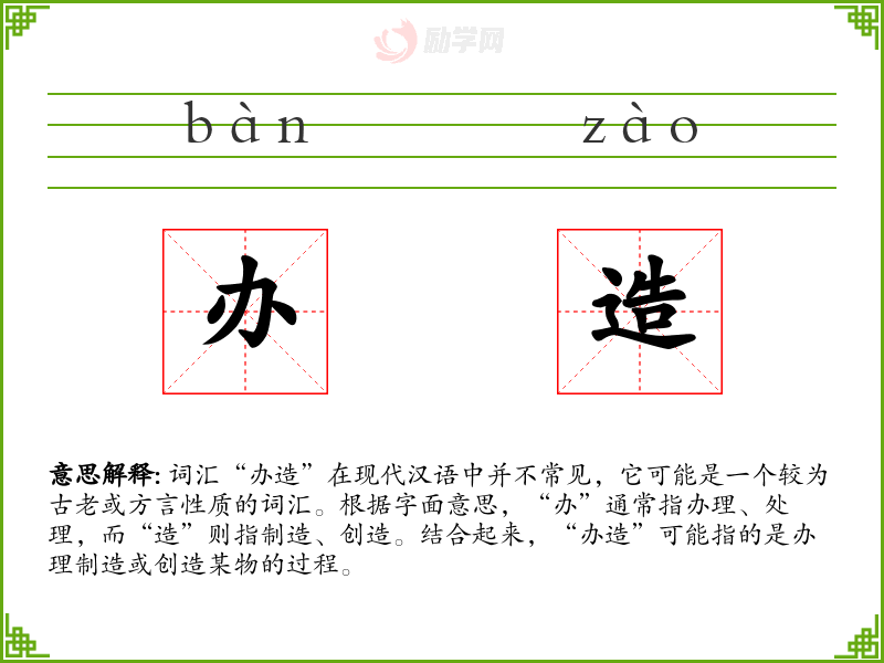 - 理解:办造这个词虽然不常见,但它体现了处理和创造的双重意义,反映了人类劳动和技艺的价值。
