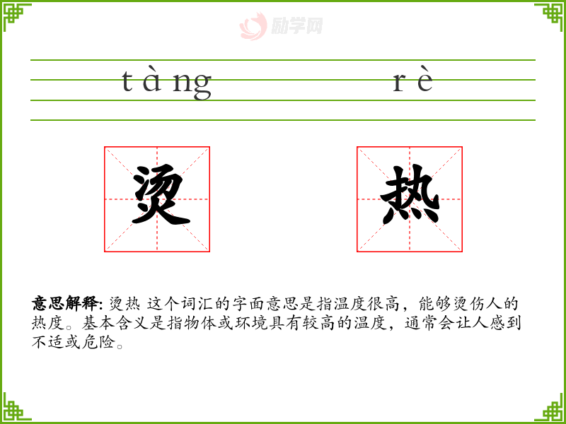 烫热 这个词汇的字面意思是指温度很高,能够烫伤人的热度。基本含义是指物体或环境具有较高的温度,通常会让人感到不适或危险。