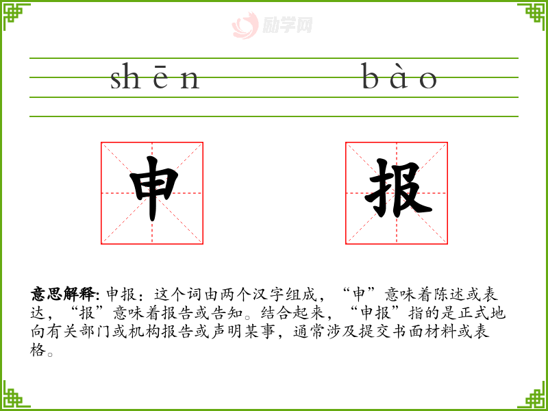申报:这个词由两个汉字组成,“申”意味着陈述或表达,“报”意味着报告或告知。结合起来,“申报”指的是正式地向有关部门或机构报告或声明某事,通常涉及提交书面材料或表格。
