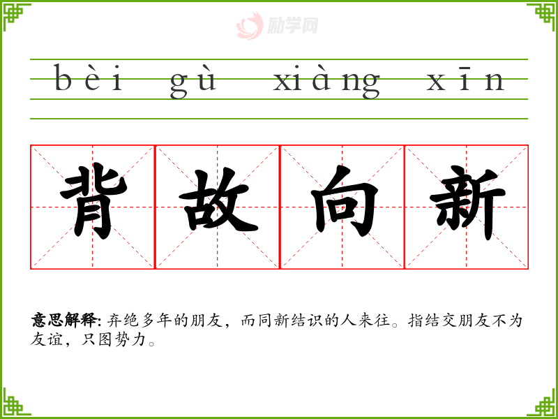 背故向新的意思是:弃绝多年的朋友,而同新结识的人来往。指结交朋友不为友谊,只图势力。