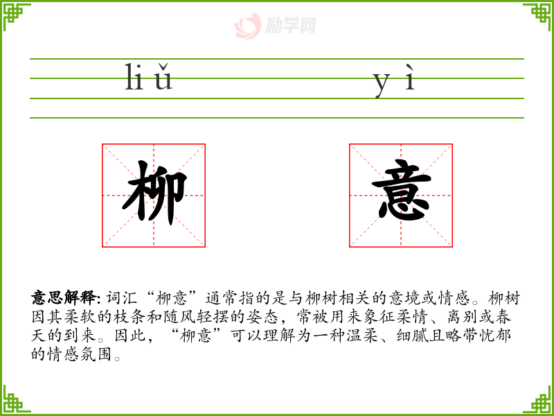 词汇“柳意”通常指的是与柳树相关的意境或情感。柳树因其柔软的枝条和随风轻摆的姿态,常被用来象征柔情、离别或春天的到来。因此,“柳意”可以理解为一种温柔、细腻且略带忧郁的情感氛围。