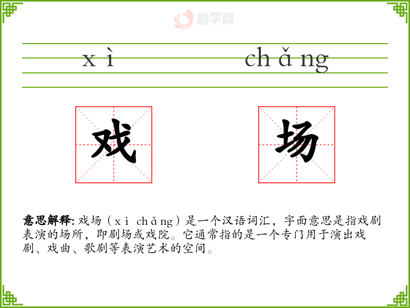 戏场(xì chǎng)是一个汉语词汇,字面意思是指戏剧表演的场所,即剧场或戏院。它通常指的是一个专门用于演出戏剧、戏曲、歌剧等表演艺术的空间。
