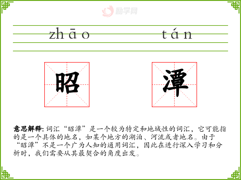 词汇“昭潭”是一个较为特定和地域性的词汇,它可能指的是一个具体的地名,如某个地方的湖泊、河流或者地名。由于“昭潭”不是一个广为人知的通用词汇,因此在进行深入学*和分析时,我们需要从其最契合的角度出发。