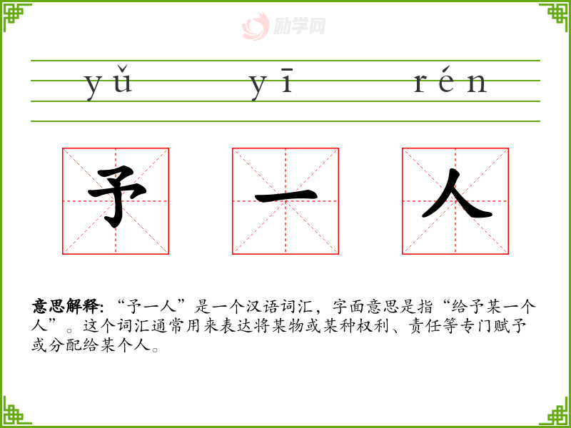 “予一人”是一个汉语词汇,字面意思是指“给予某一个人”。这个词汇通常用来表达将某物或某种权利、责任等专门赋予或分配给某个人。