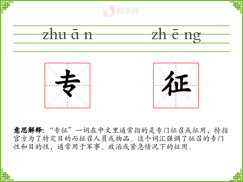在文学中,“专征”可能被用来描述历史**,如古代帝王为了战争而征召士兵。在口语中,这个词汇可能不太常用,但在新闻报道或官方声明中,特别是在涉及国家紧急状态或军事行动时,可能会出现。在专业领域,如法律或军事学,这个词汇有更精确的定义和使用场景。