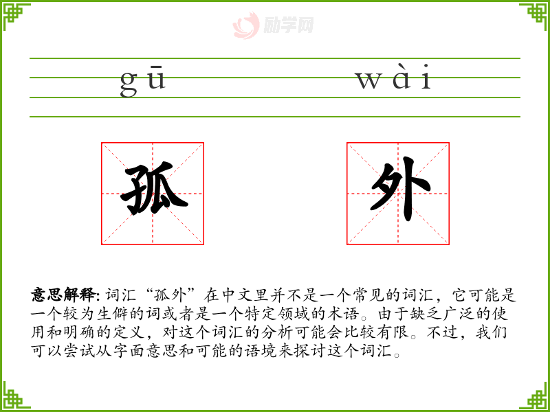 词汇“孤外”在中文里并不是一个常见的词汇,它可能是一个较为生僻的词或者是一个特定领域的术语。由于缺乏广泛的使用和明确的定义,对这个词汇的分析可能会比较有限。不过,我们可以尝试从字面意思和可能的语境来探讨这个词汇。