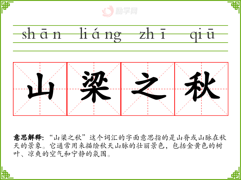 “山梁”一词源自古代汉语,指的是山脊或山脉的顶部。而“之秋”则是对秋天的直接描述。这个词汇在古代文学中已有使用,随着时间的推移,其使用范围和语境有所扩展。
