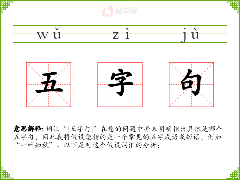 词汇“[五字句]”在您的问题中并未明确指出具体是哪个五字句,因此我将假设您指的是一个常见的五字成语或短语,例如“一叶知秋”。以下是对这个假设词汇的分析: