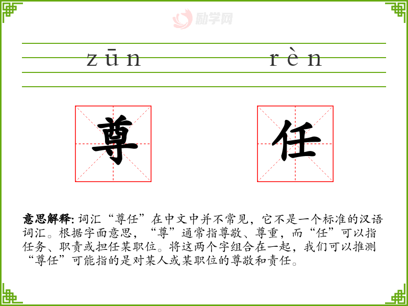 词汇“尊任”在中文中并不常见,它不是一个标准的汉语词汇。根据字面意思,“尊”通常指尊敬、尊重,而“任”可以指任务、职责或担任某职位。将这两个字组合在一起,我们可以推测“尊任”可能指的是对某人或某职位的尊敬和责任。