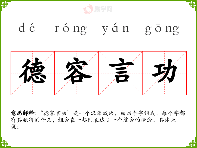 “德容言功”是一个汉语成语,由四个字组成,每个字都有其独特的含义,组合在一起则表达了一个综合的概念。具体来说: