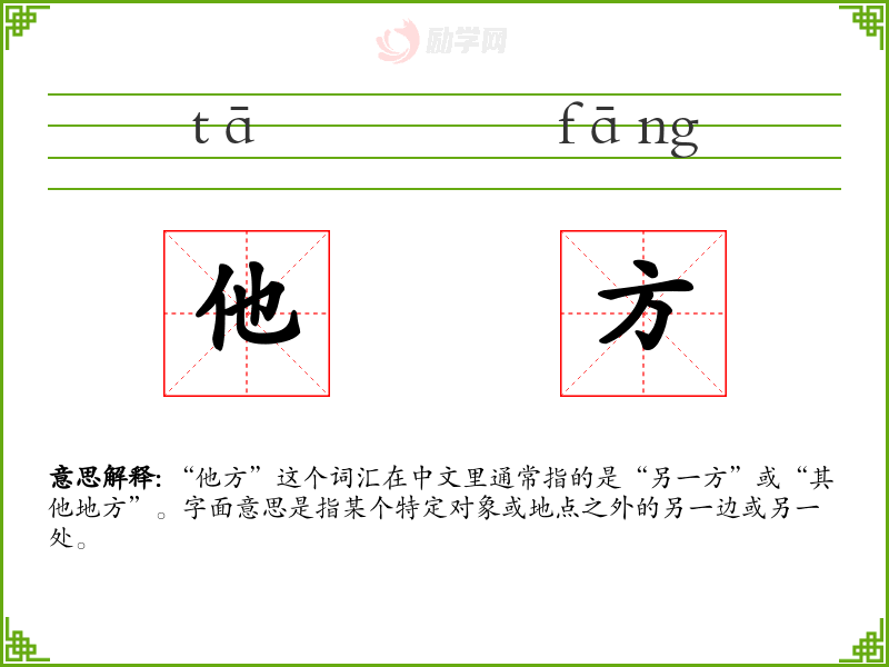 - 文学:在文学作品中,“他方”常用来营造一种遥远或神秘的氛围,如“他方世界”可能指一个未知的、充满奇幻色彩的地方。