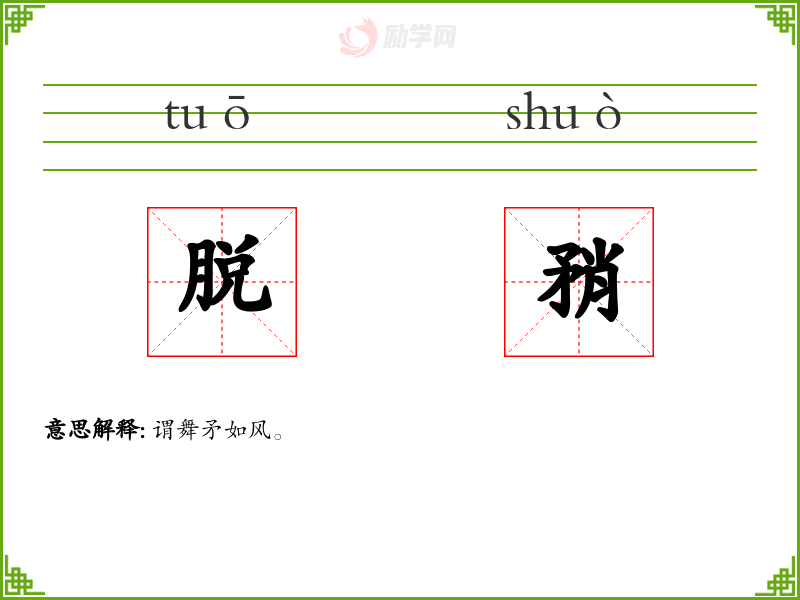 脱[ tuō ] 1. (形声。从肉,兑(duì)声。本义:肉去皮骨)。 2. 同本义。 【引证】 《说文》-脱,消肉臞也。 《尔雅》-肉去骨曰脱。 《礼记·内则》-肉曰脱之,鱼曰作之,枣曰新之。 《列子·天瑞》-其状若脱。 清·方苞《左忠毅公逸事》-筋骨尽脱矣。 [更多解释]
