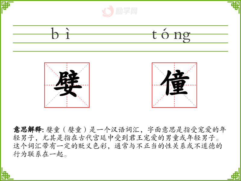 嬖童(嬖童)是一个汉语词汇,字面意思是指受宠爱的年轻男子,尤其是指在古代宫廷中受到君王宠爱的男童或年轻男子。这个词汇带有一定的贬义色彩,通常与不正当的性关系或不道德的行为联系在一起。