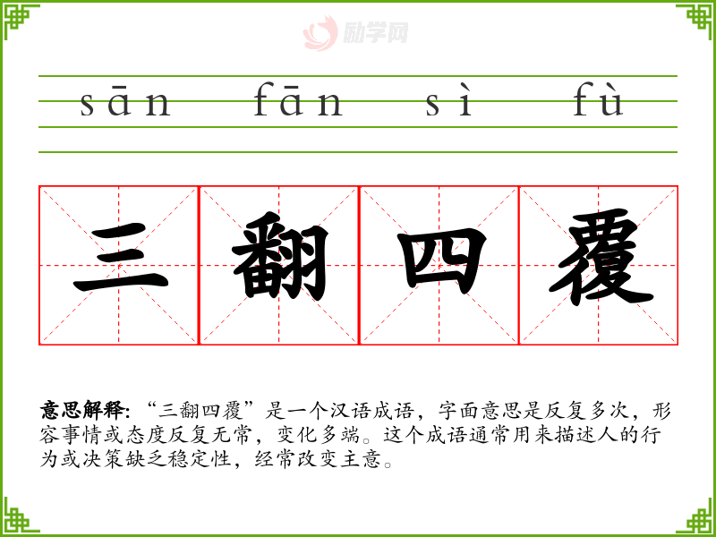 “三翻四覆”是一个汉语成语,字面意思是反复多次,形容事情或态度反复无常,变化多端。这个成语通常用来描述人的行为或决策缺乏稳定性,经常改变主意。