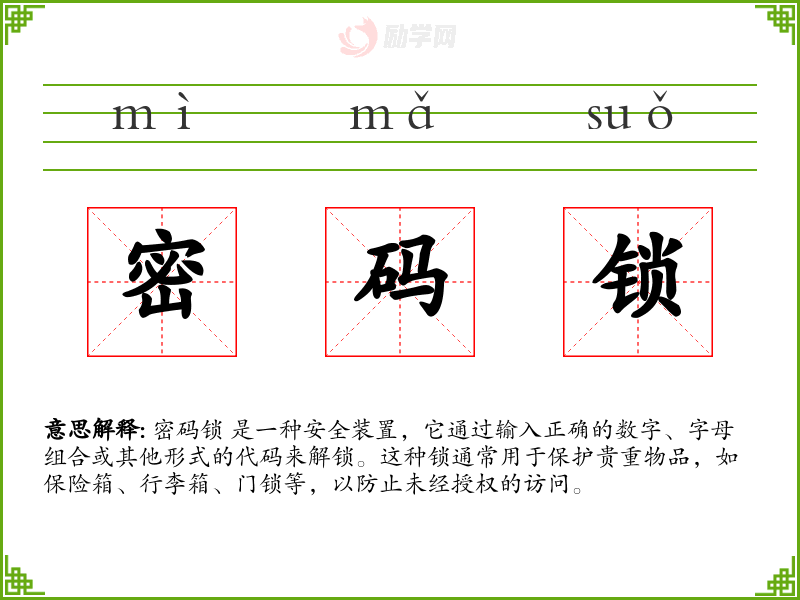 密码锁的意思是:安有密码装置的锁,开启时需使用设定的密码。