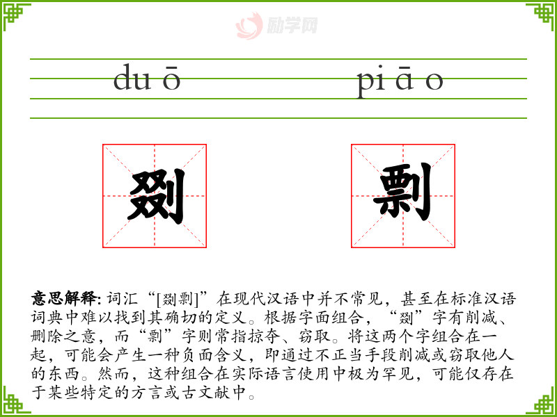 词汇“[剟剽]”在现代汉语中并不常见,甚至在标准汉语词典中难以找到其确切的定义。根据字面组合,“剟”字有削减、删除之意,而“剽”字则常指掠夺、窃取。将这两个字组合在一起,可能会产生一种负面含义,即通过不正当手段削减或窃取他人的东西。然而,这种组合在实际语言使用中极为罕见,可能仅存在于某些特定的方言或古文献中。