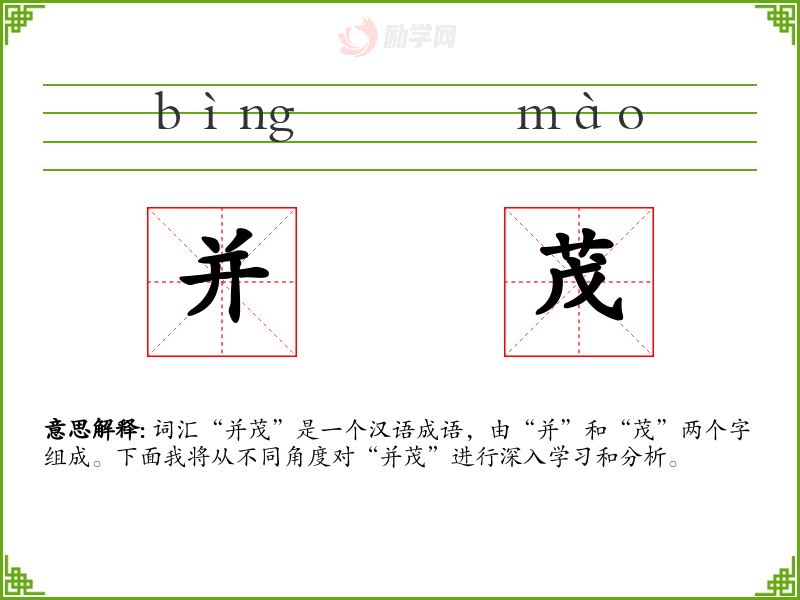词汇“并茂”是一个汉语成语,由“并”和“茂”两个字组成。下面我将从不同角度对“并茂”进行深入学*和分析。