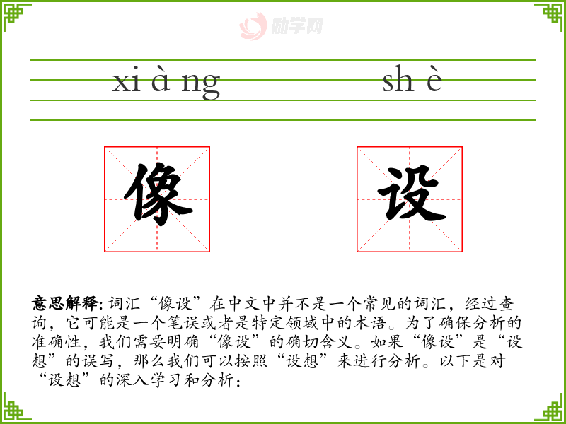 词汇“像设”在中文中并不是一个常见的词汇,经过查询,它可能是一个笔误或者是特定领域中的术语。为了确保分析的准确性,我们需要明确“像设”的确切含义。如果“像设”是“设想”的误写,那么我们可以按照“设想”来进行分析。以下是对“设想”的深入学*和分析: