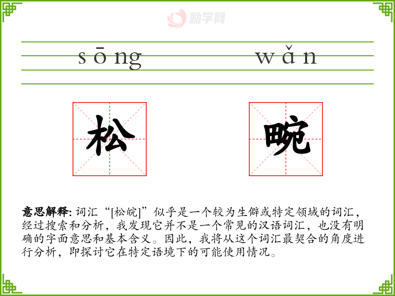 词汇“[松皖]”似乎是一个较为生僻或特定领域的词汇,经过搜索和分析,我发现它并不是一个常见的汉语词汇,也没有明确的字面意思和基本含义。因此,我将从这个词汇最契合的角度进行分析,即探讨它在特定语境下的可能使用情况。