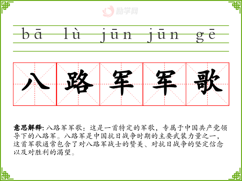 八路军军歌不仅是一首歌曲,它是*抗日战争历史的一部分,承载着深刻的文化和情感意义。在学语言和历史的过程中,理解和欣赏这样的词汇对于深化文化理解和情感连接至关重要。