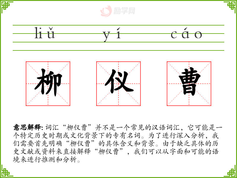 词汇“柳仪曹”并不是一个常见的汉语词汇,它可能是一个特定历史时期或文化背景下的专有名词。为了进行深入分析,我们需要首先明确“柳仪曹”的具体含义和背景。由于缺乏具体的历史文献或资料来直接解释“柳仪曹”,我们可以从字面和可能的语境来进行推测和分析。