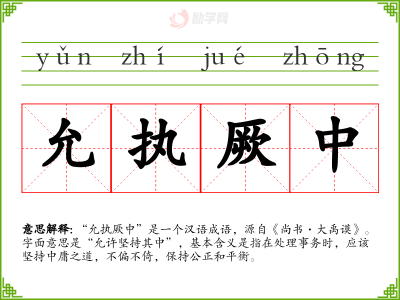 “允执厥中”是一个汉语成语,源自《尚书·大禹谟》。字面意思是“允许坚持其中”,基本含义是指在处理事务时,应该坚持中庸之道,不偏不倚,保持公正和平衡。