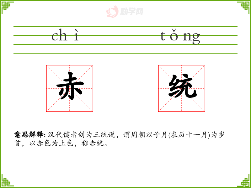 赤统的意思是:汉代儒者创为三统说,谓周朝以子月(农历十一月)为岁首,以赤色为上色,称赤统。