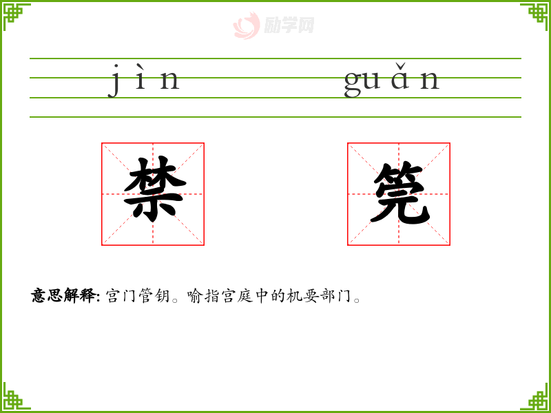 禁筦的意思是:宫门管钥。喻指宫庭中的机要部门。