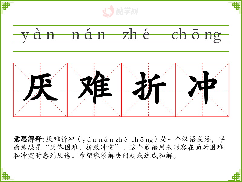 厌难折冲(yàn nán zhé chōng)是一个汉语成语,字面意思是“厌倦困难,折服冲突”。这个成语用来形容在面对困难和冲突时感到厌倦,希望能够解决问题或达成和解。