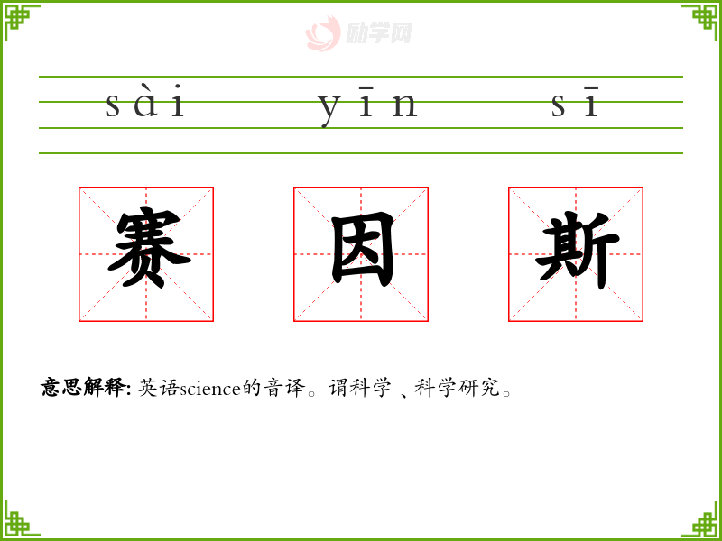 赛因斯的意思是:英语science的音译。谓科学﹑科学研究。