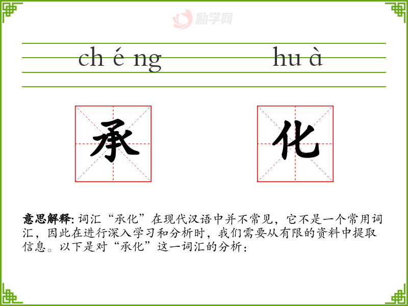 词汇“承化”在现代汉语中并不常见,它不是一个常用词汇,因此在进行深入学习和分析时,我们需要从有限的资料中提取信息。以下是对“承化”这一词汇的分析: