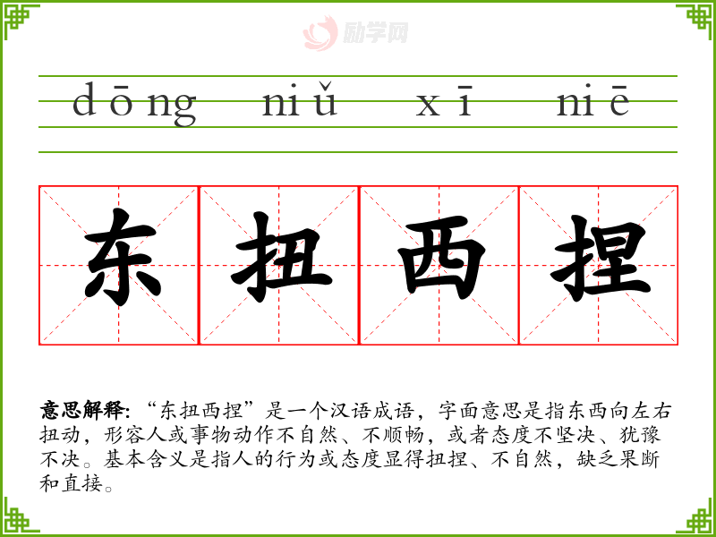 “东扭西捏”是一个汉语成语,字面意思是指东西向左右扭动,形容人或事物动作不自然、不顺畅,或者态度不坚决、犹豫不决。基本含义是指人的行为或态度显得扭捏、不自然,缺乏果断和直接。