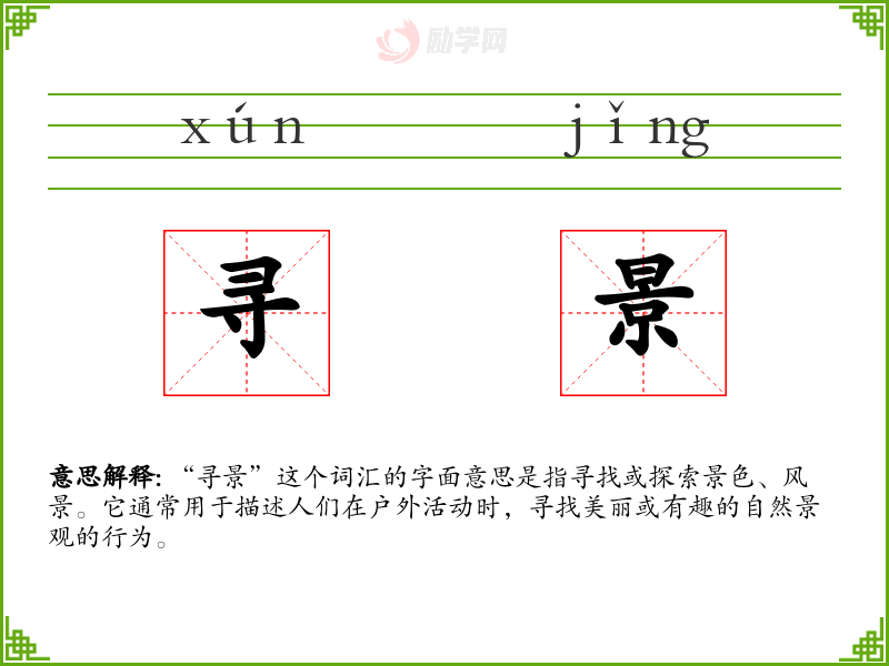 “寻景”这个词汇的字面意思是指寻找或探索景色、风景。它通常用于描述人们在户外活动时,寻找美丽或有趣的自然景观的行为。