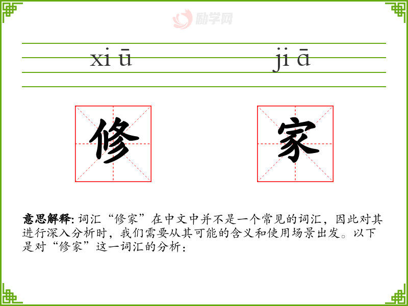 词汇“修家”在中文中并不是一个常见的词汇,因此对其进行深入分析时,我们需要从其可能的含义和使用场景出发。以下是对“修家”这一词汇的分析: